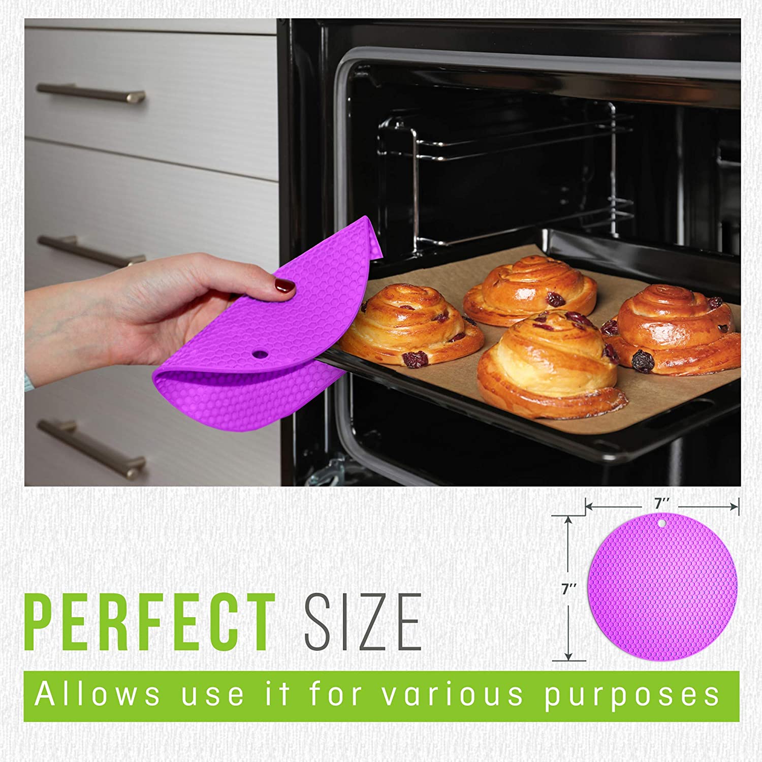 No Slipping: The base sticks on the surface without moving or sliding, assuring the stability and safety of your dishes and utensils. It is also heat resistant and can withstand pots of freshly cooked hot food or beverages.